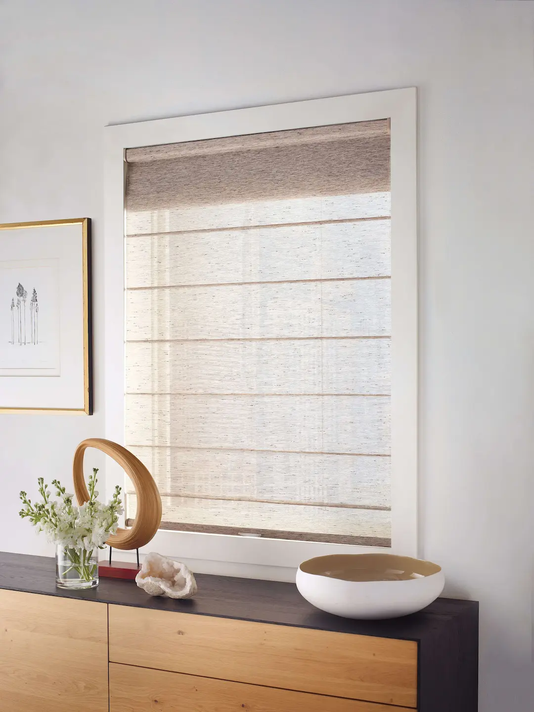 The transitional style of Alustra Woven Textures Roman Shades brings organic luxury to a space.